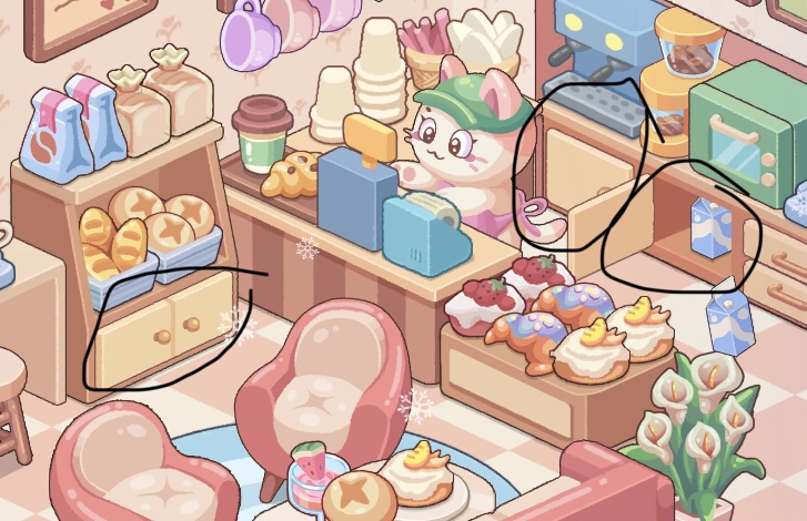 パンの下はコーヒー豆の袋、キッチン左は瓶、右は牛乳パック