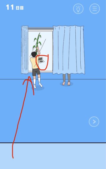 左に移動して左のカーテンを開けて竹を使ってゲームを入手する