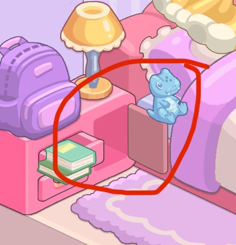 ベッド横の収納に恐竜のぬいぐるみと本を入れる