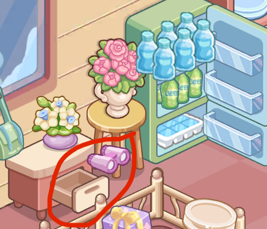 冷蔵庫にドリンク、氷、その左隣りに双眼鏡を入れる