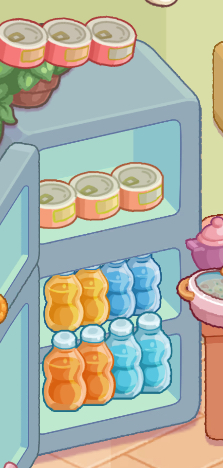 2階、冷蔵庫にドリンク、缶詰をいれる