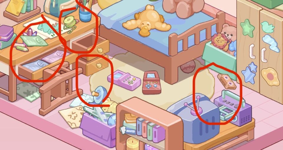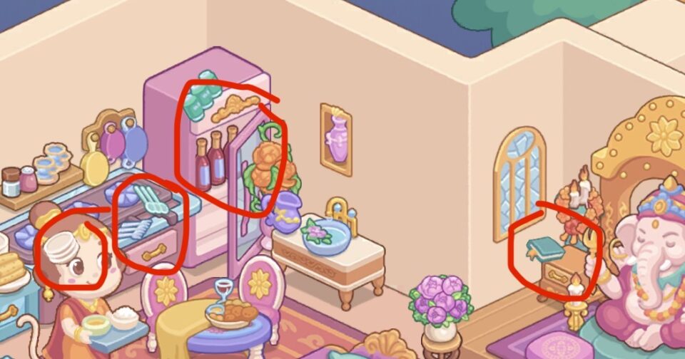 様々なシチュエーションの部屋の中を、家具や鉢植え、建造物等を正しい位置に配置していきましょう。