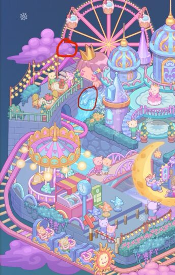 左、スケートのキャラクターは赤丸のところ(バグで消える可能性あり)