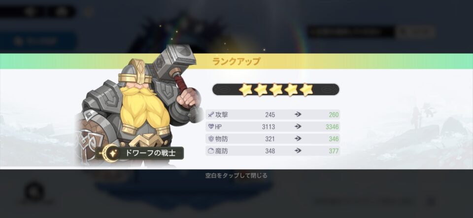 育成はシンプルで装備の装着やランクアップ、レベルアップとよくある放置RPG系の育成が踏襲されています。