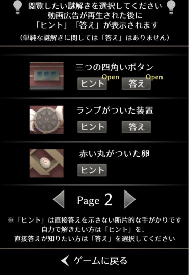 右上のヒントマークを押して表示されるヒント一覧から目的の謎解きを選択します。