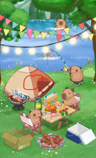 テントを広げ、テントをタップすると薪が現れるので、落ちている薪と出てきた薪を配置する