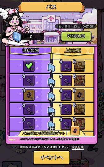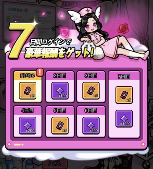 | 累計ログイン1日 | イベントミッションポイント×3 イベントパスポイント×25 白衣の天使ガチャ券×1 |