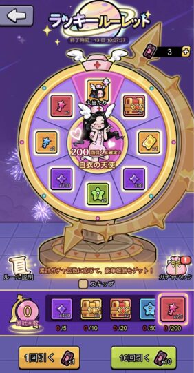 手に入れた白衣の天使ガチャ券を使用してラッキールーレットにチャレンジしましょう。
