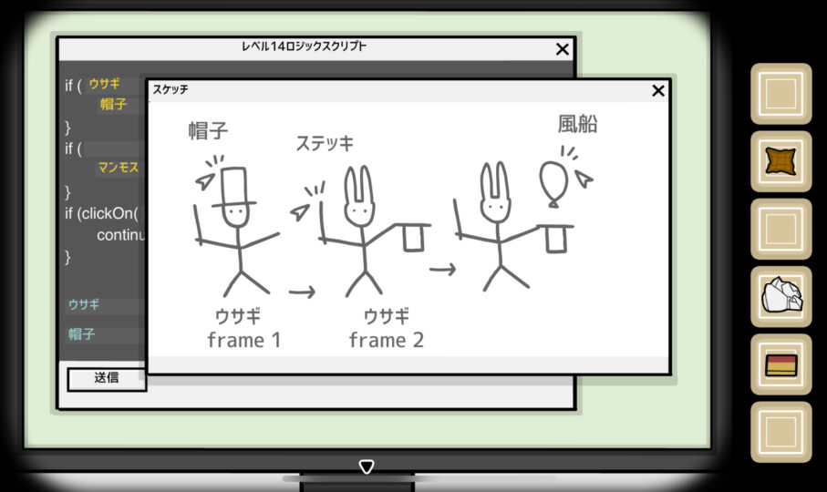 パソコンに帽子クリック、うさぎf1、ステッキクリック、うさぎf2、風船クリックを確認